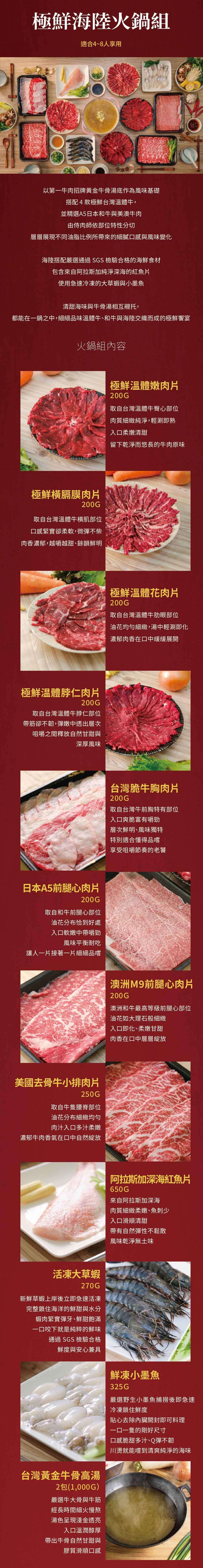 極鮮溫體花肉片200g、極鮮溫體嫩肉片200g、極鮮溫體脖仁火鍋片200g、極鮮横膈膜肉片200g、台湾脆牛胸肉片200g、澳洲M9前腿心肉片200g、日本A5前腿心肉片200g、美國特選去骨牛小排肉片250g、阿拉斯加深海紅魚片650g、活凍大草蝦270g、鮮凍小墨魚325g、黄金牛骨湯1000g