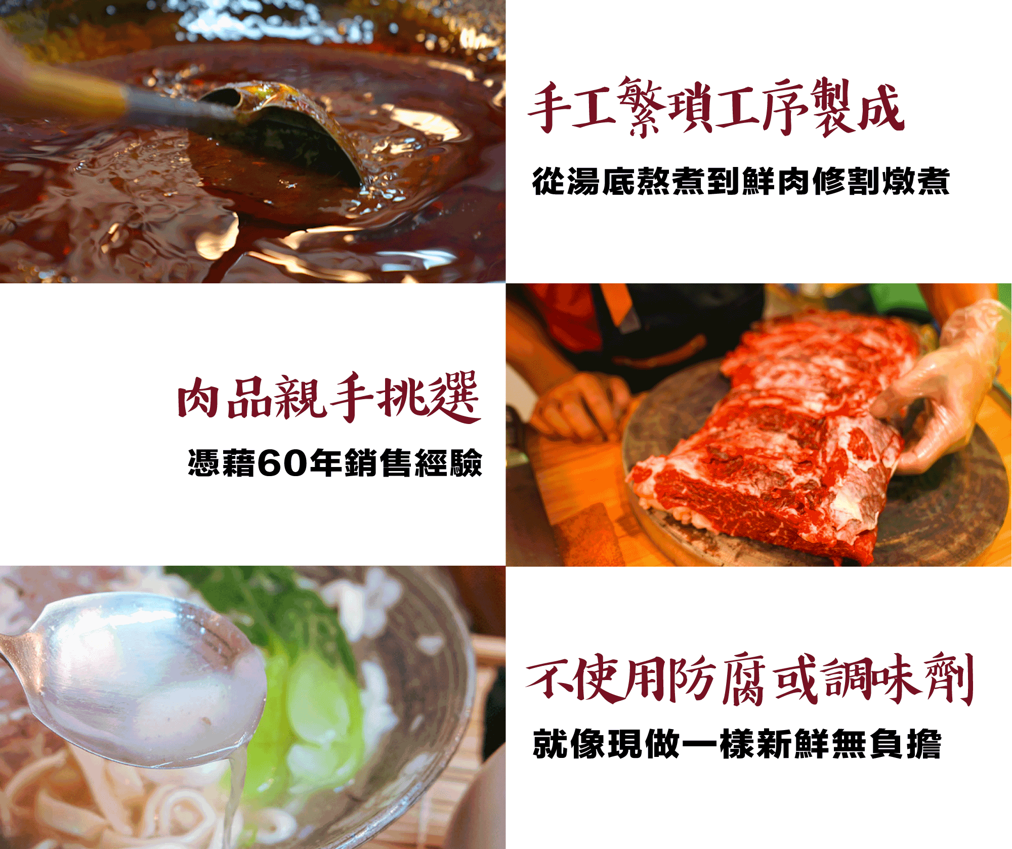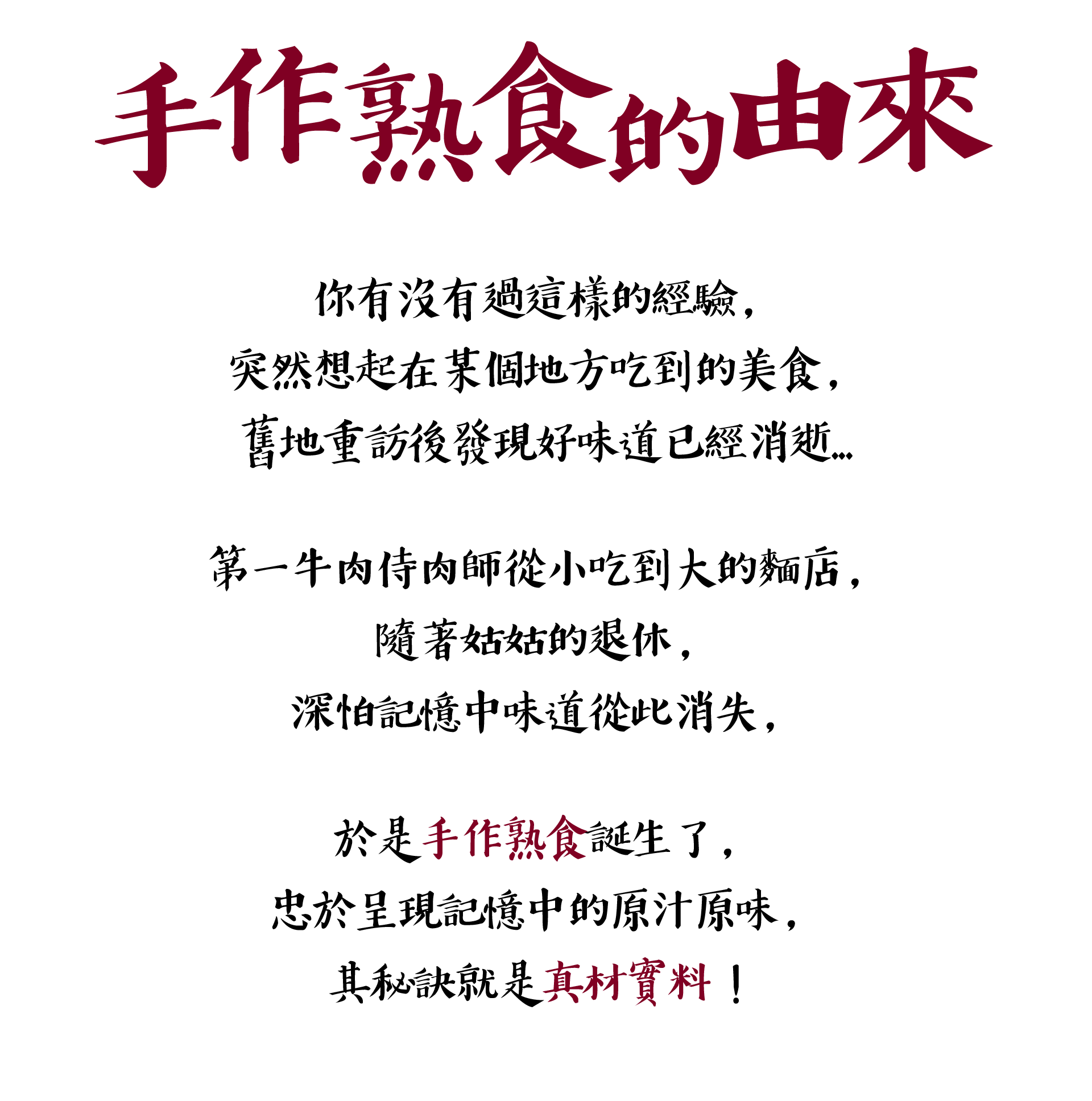 第一牛肉期盼能借由雙手讓更多人品嘗到依循傳統多重工法、不使用調味劑和化學添加物所製成的手作熟食,讓你的生活不再將就,而是講究。