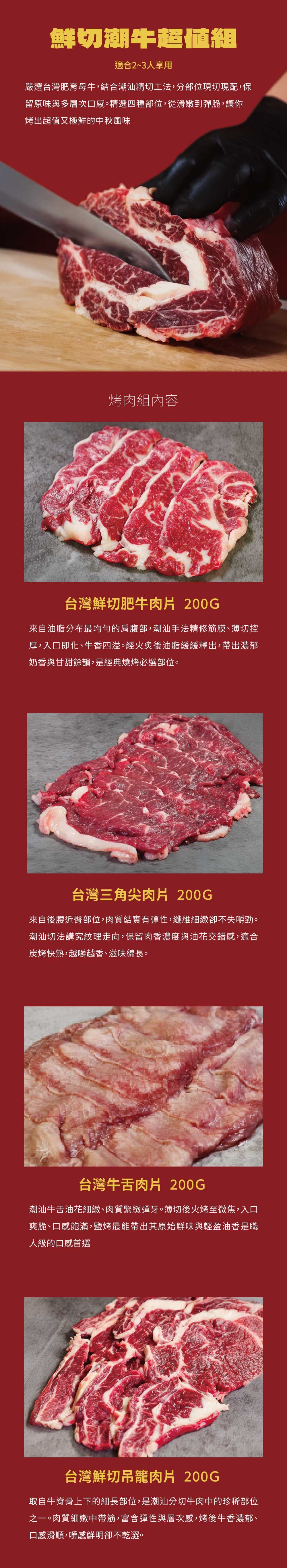 嚴選台灣肥育母牛,以潮汕精切工法去筋修膜,保留鮮甜細緻;精選四大部位,從滑嫩到彈脆,烤出超值極鮮的中秋美味。