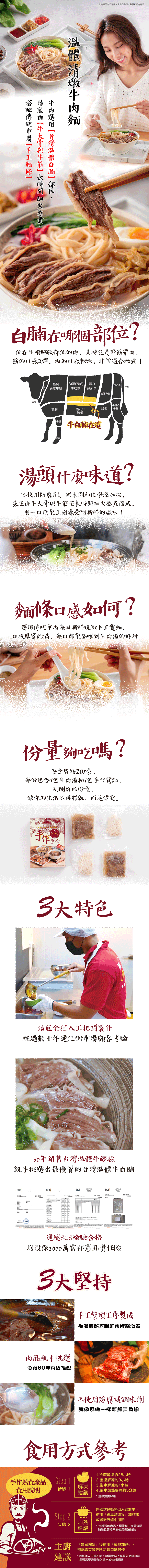 依循傳統繁複工法製成,清燉牛肉湯的基底由牛大骨與牛筋花長時間細火熬煮而成,牛肉的挑選則憑藉著第一牛肉60年銷售台灣溫體牛肉的經驗,精挑細選出肉質軟嫩、口感適中的台灣溫體牛『白腩』部位,搭配上傳統市場新鮮手打寬麵,