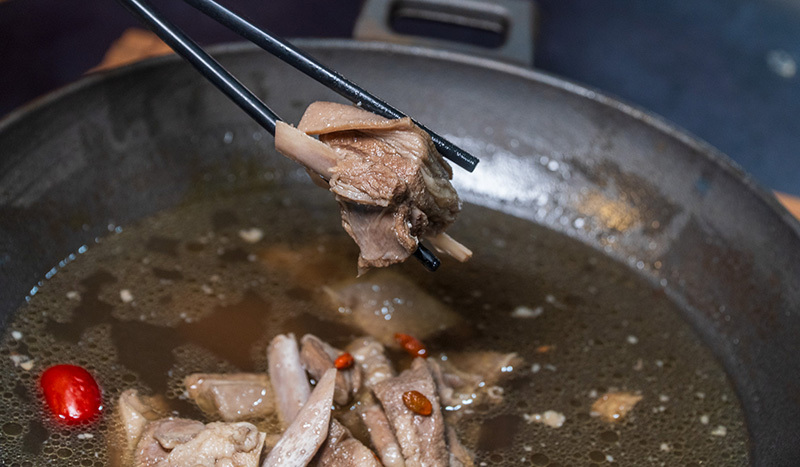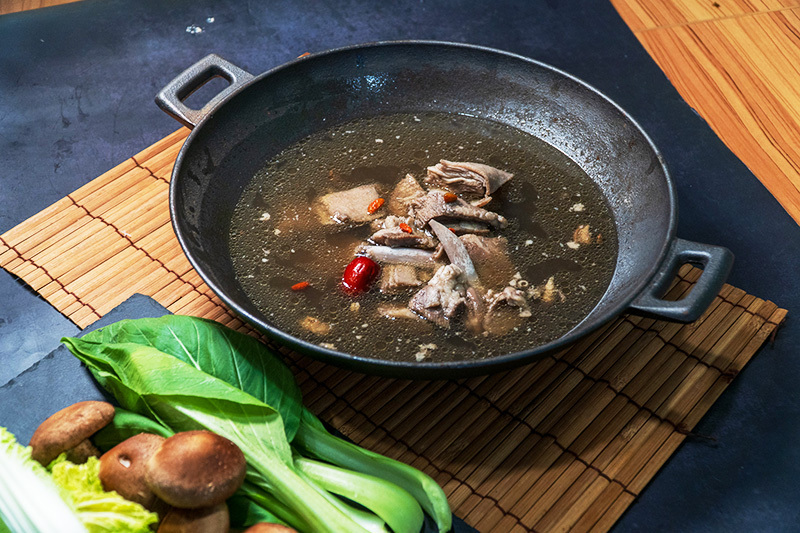 使用眾多中藥材燉煮並加入黑麻油提升層次感,全程人工控管,確保每塊羊肉鮮嫩多汁並與高湯融為一體,