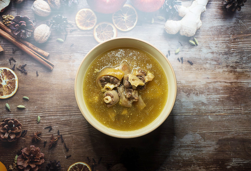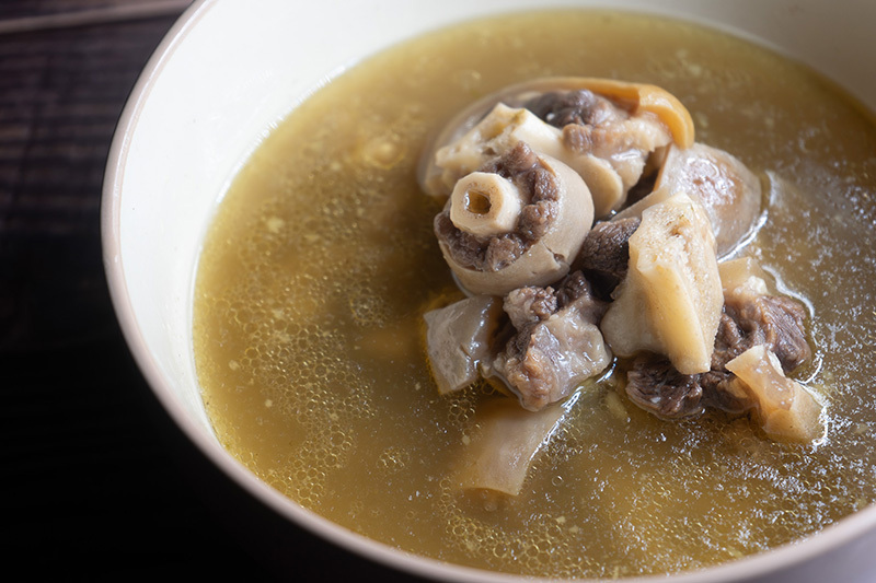 由牛尾和牛骨經長時間精燉散出的骨髓、蛋白質、膠質與鈣質等營養成分,