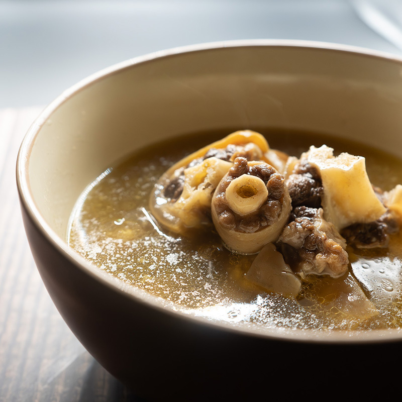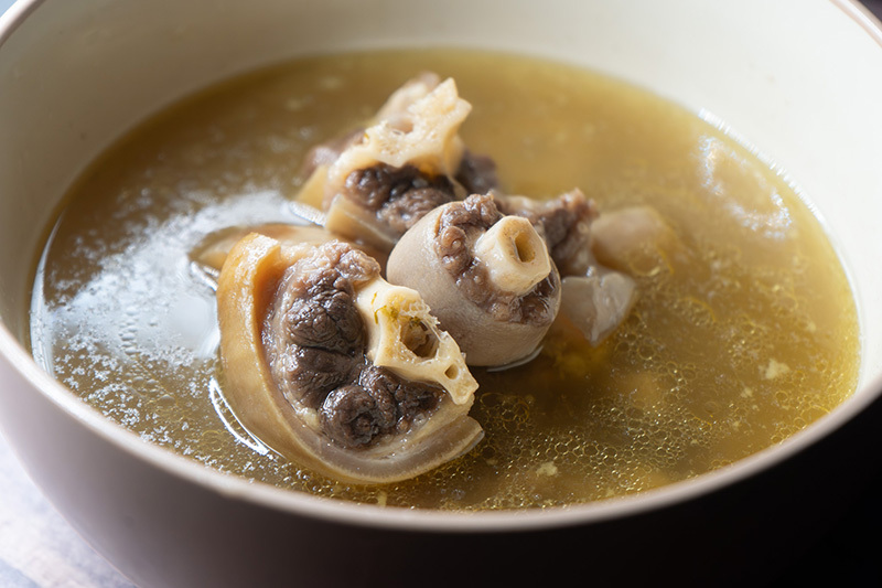 除了能吃到口感豐富的牛尾,還能從淺金黃色的高湯中喝到由牛尾和牛骨經長時間精燉散出的骨髓、蛋白質、膠質與鈣質等營養成分,