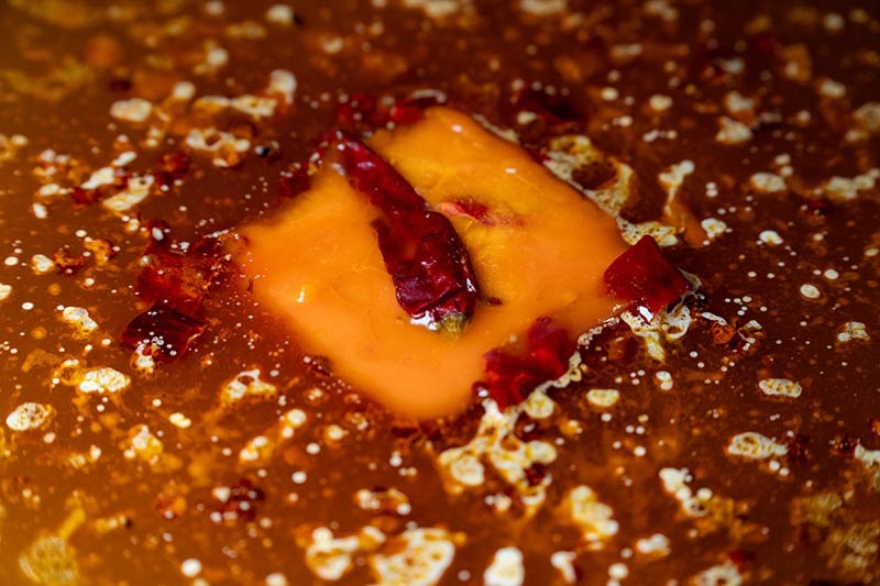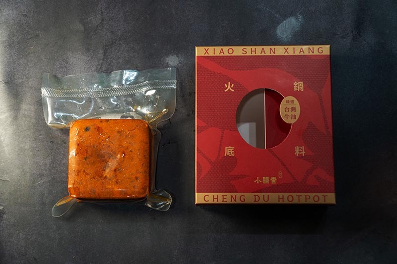 依循四川麻辣火鍋傳統繁複工法製成,使用『台灣牛油』、星一代、郫縣豆瓣、豆鼓、花椒、豆蔻、小茴香、白芷、高粱酒、老薑及多種不含防腐劑的辛香料製成,