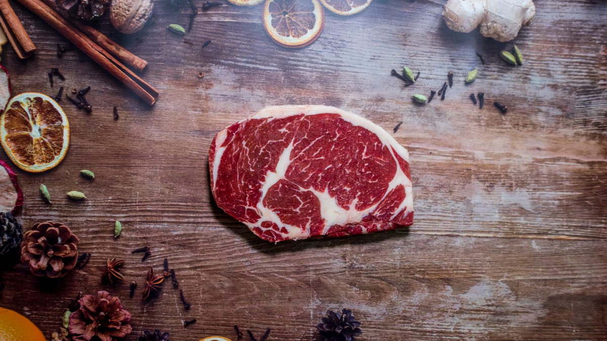 切開五至七分熟的肋眼牛排,粉嫩的肉質中透著微微的肉汁光澤,